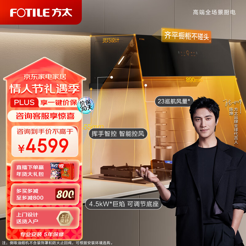 方太(FOTILE)抽吸油烟机灶具套装 侧吸式变频烟灶套装23大风量智能巡航挥手 煤气双灶JCD10TA+TH27B(液化气)价格:4599.00元!