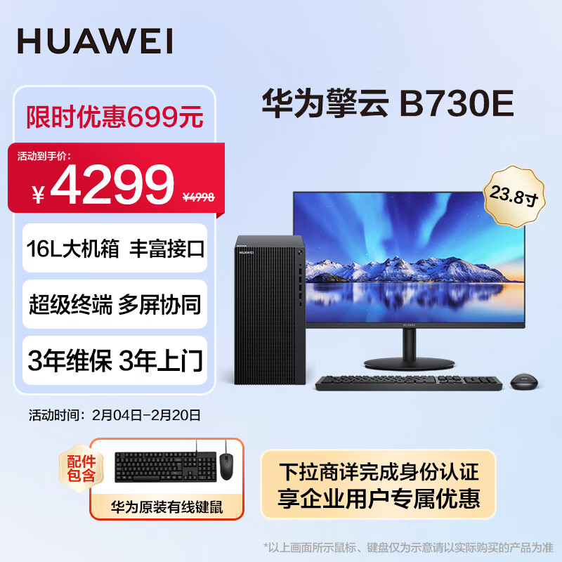 华为擎云B730E 商用办公台式电脑主机 (酷睿12代i5 16G 256G SSD+1T HDD)23.8英寸显示器 超级终端价格:4299.00元!