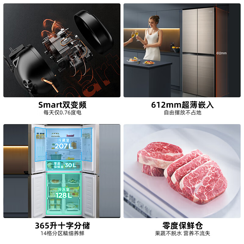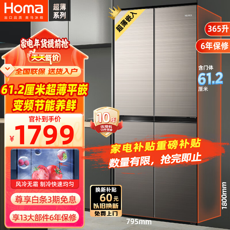 奥马(Homa)超薄冰箱365升风冷无霜一级能效双变频十字对开门双开门四门家用薄款电冰箱BCD-365WDK/B价格:1799.00元!