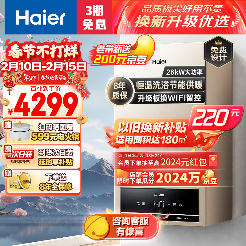 海尔(Haier)燃气壁挂炉天然气板换式采暖炉家用地暖供暖全屋热水智慧节能 WIFI智控多点恒温L1PB26-HJ5ACHMU1价格:4299.00元!