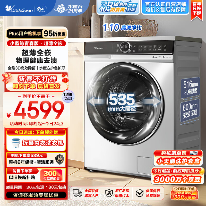 小天鹅(LittleSwan)滚筒洗衣机全自动【小蓝鲸青春版TG100VC807】超薄全嵌 超微净泡洗 白色防变黄 护色水魔方 10公斤价格:4599.00元!