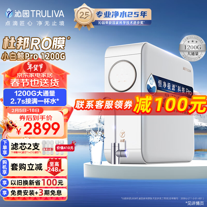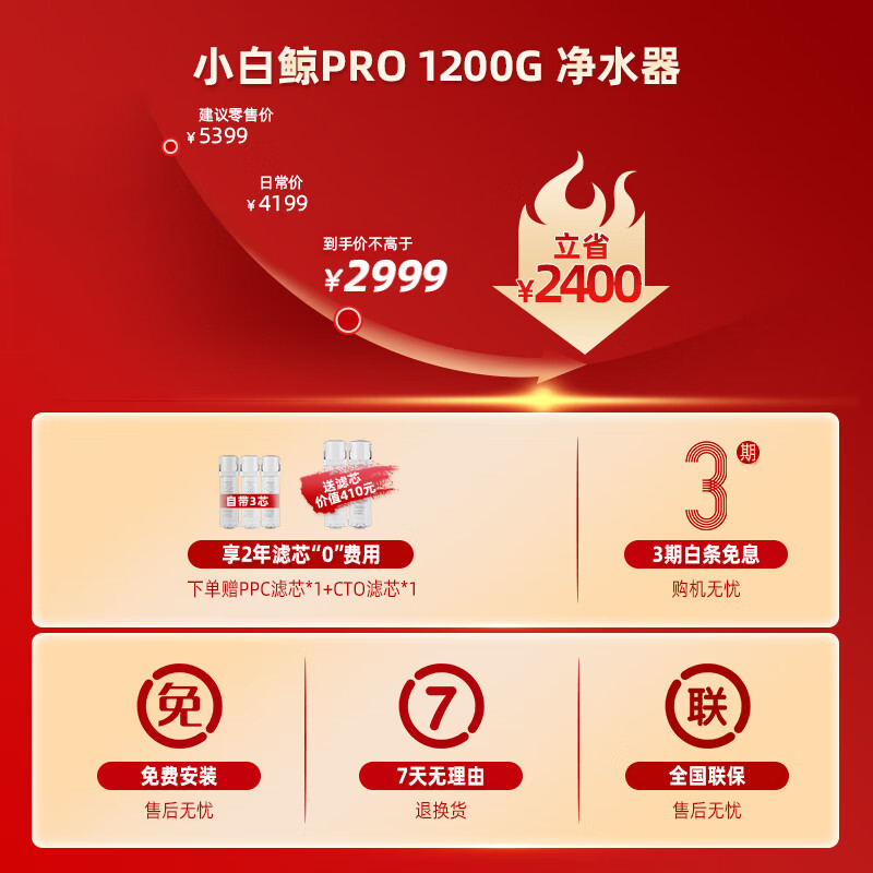 沁园(TRULIVA)小白鲸pro大通量1200G家用净水器5年RO反渗透厨下直饮3.3L/分钟 UR-S51246i价格:2999.00元!