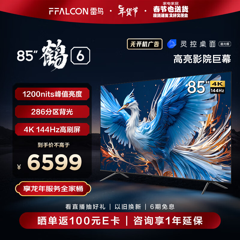 FFALCON雷鸟 鹤6 24款 85英寸游戏电视 144Hz高刷 4K超高清 4+64GB 智能液晶平板电视机85S575C PRO价格:6599.00元!