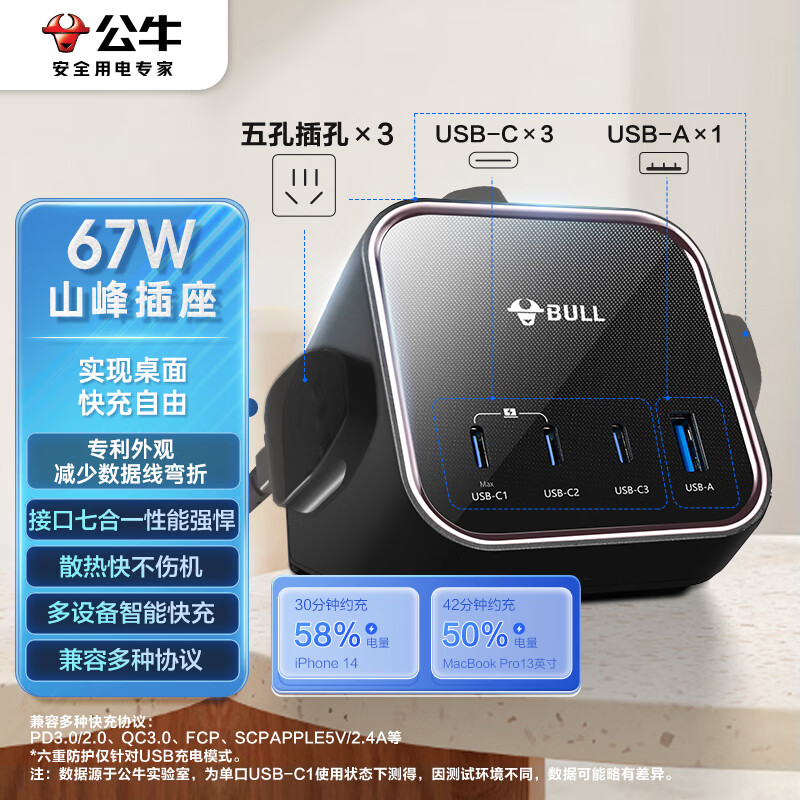 公牛(BULL)67W PD苹果快充笔记本多功能插座/插线板/插排/接线板 USB(3C1A)+3插孔 全长1.5米 GNV-MS1673价格:219.00元!
