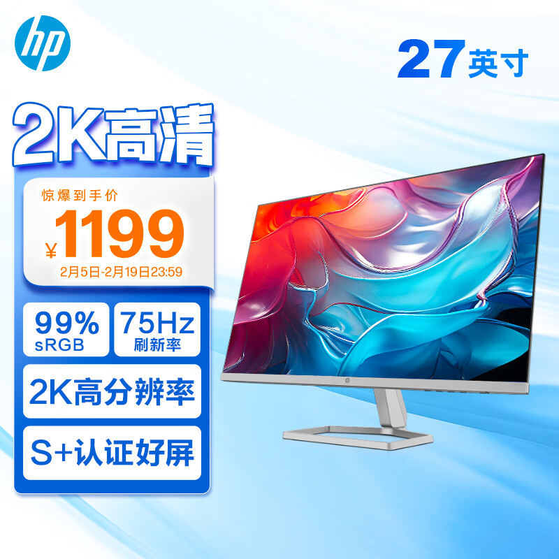 惠普(HP) 办公显示器 27英寸 2K 75Hz IPS 物理防蓝光 S+认证 电脑显示屏 M27FQ(带HDMI线)价格:1199.00元!
