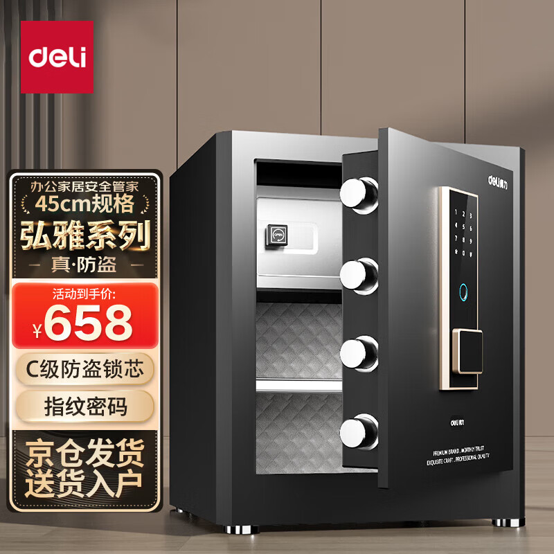得力保险柜 家用办公指纹密码保管箱小型保密箱全钢防盗可入墙入柜保管柜保险箱 45cm曜岩黑 弘雅系列价格:658.00元!