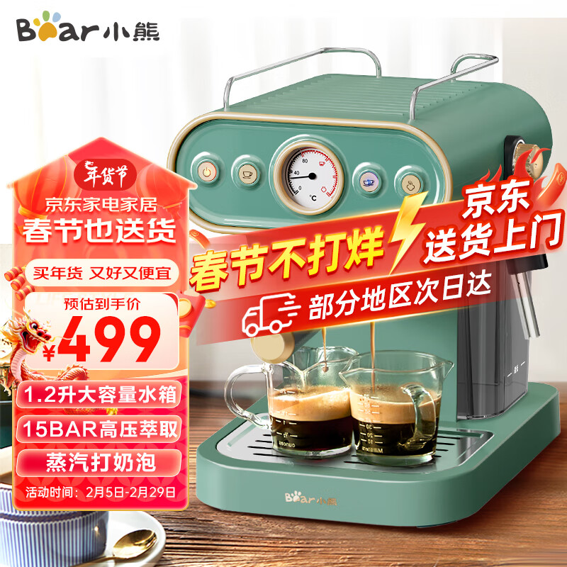 小熊(Bear)咖啡机家用复古意式泵压式15Bar高压喷射可打奶泡1.2升大容量水箱KFJ-B12X1价格:499.00元!