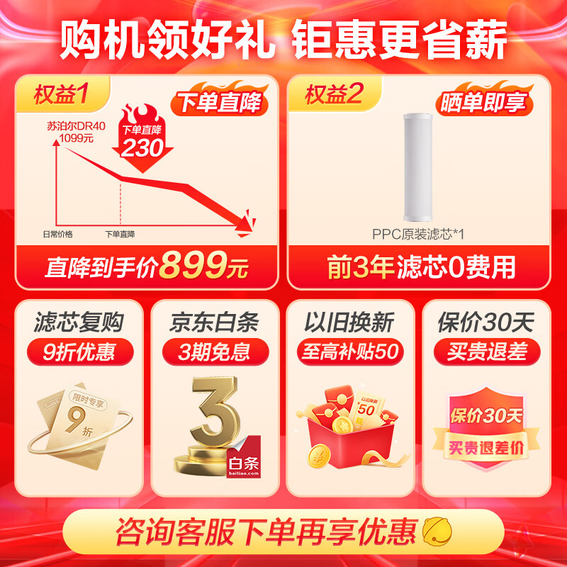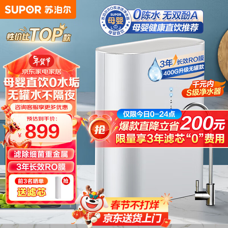 苏泊尔(SUPOR)净水器家用直饮机RO反渗透纯水机400G大通量过滤器DR40滤水器台下软水机厨下厨房净水机价格:898.00元!