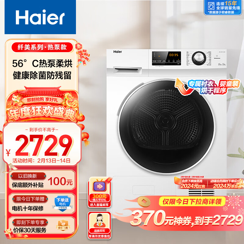 海尔(Haier)烘干机 10公斤防缠绕除毛屑热泵类家用大容量滚筒干衣机多模式烘衣服烘衣机 EHG100129W价格:3099.00元!