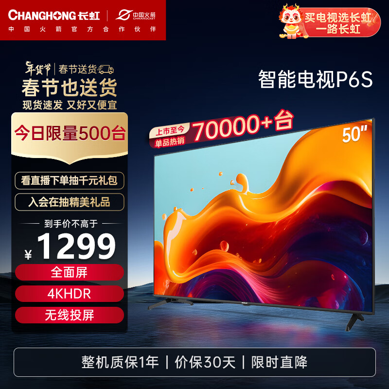 长虹电视50P6S 50英寸智能 4KHDR 手机投屏 屏平板液晶LED电视机(黑色)价格:1299.00元!