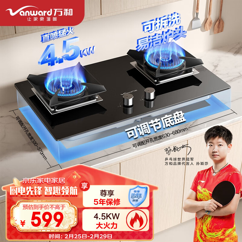 万和(Vanward)燃气灶液化气 双灶具 家用4.5kW猛火灶台嵌两用煤气炉煤气灶 钢化玻璃 可调节底盘JZY-C5L90S价格:599.00元!
