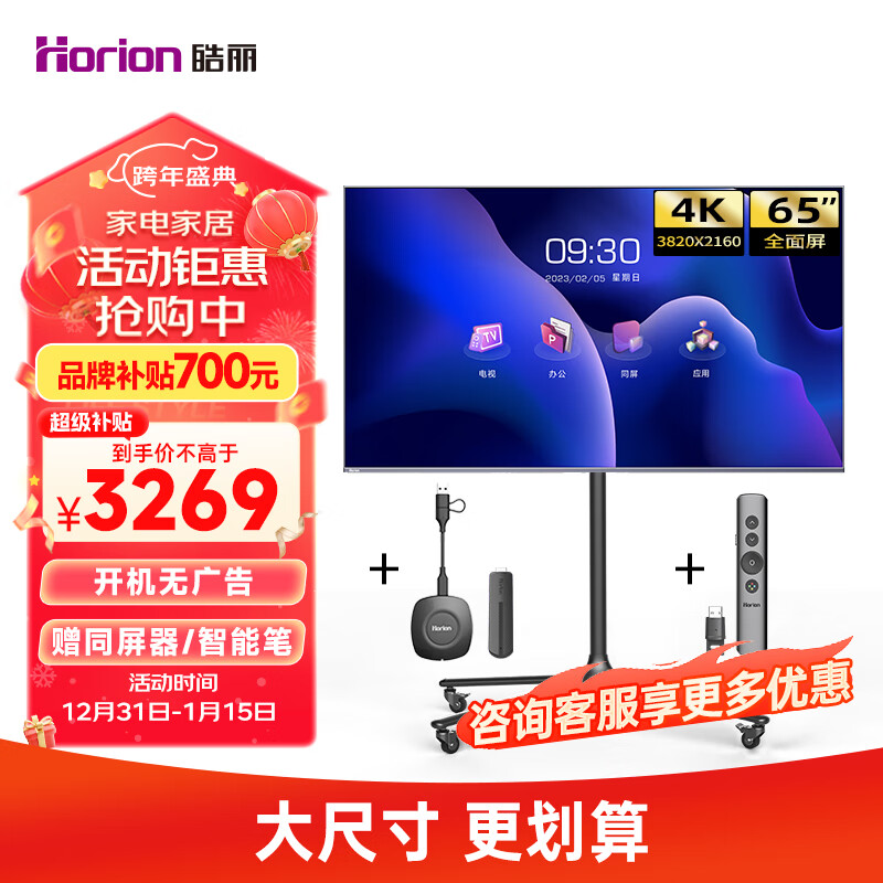 皓丽(Horion)会议电视平板一体机65英寸移动投影电视一体机智慧屏投屏商用显示会议室教学培训大屏65H5套装价格:3269.00元!