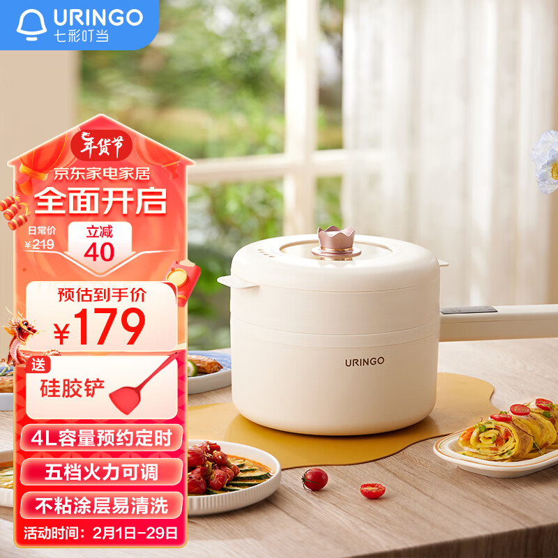 七彩叮当URINGO电煮锅小电锅家用涮锅宿舍小锅电火锅便携式大容量4升多功能锅配蒸笼SD06Z价格:179.00元!
