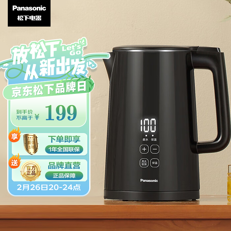 松下 Panasonic 电热水壶 304不锈钢内胆实时显温多段温控保温 NC-TD151 黑色1.5L价格:199.00元!
