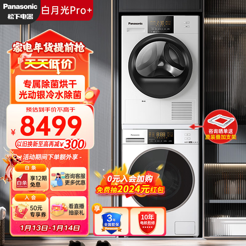 松下(Panasonic)洗烘套装 白月光Pro+ 10kg滚筒洗衣机+热泵烘干机 光动银除菌 1.1洗净比 羽绒服烘 3E1AK+EH31JW价格:8499.00元!