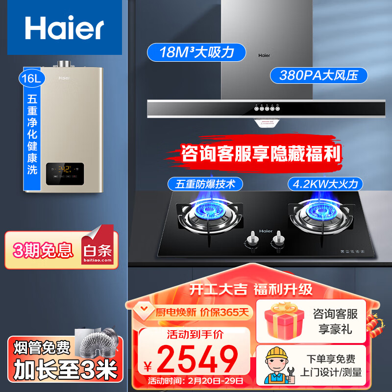 海尔(Haier)抽油烟机燃气灶套装18m3一级能效欧式顶吸E900T6V+4.2KW灶Q235+16升热水器16K3BD厨房三件套[家电]价格:2549.00元!