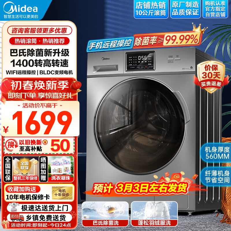 美的(Midea)滚筒洗衣机10公斤变频全自动家用大容量 巴氏除菌一级能效 MG100S31DG5-Y1YW价格:1649.00元!