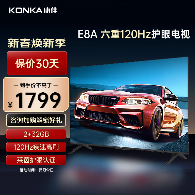 康佳电视 55E8A 55英寸 2+32GB 120Hz高刷护眼电视 4K超清屏投屏 智能语音液晶平板电视机以旧换新价格:1748.00元!