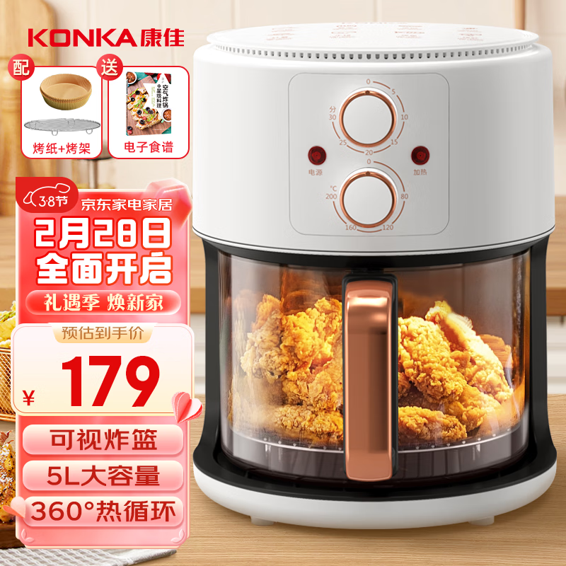 康佳(KONKA)空气炸锅 烤肉锅 家用多功能 智能玻璃内胆可视 低脂 无油煎炸空烤5L大容量 KKZG-5006-W价格:179.00元!