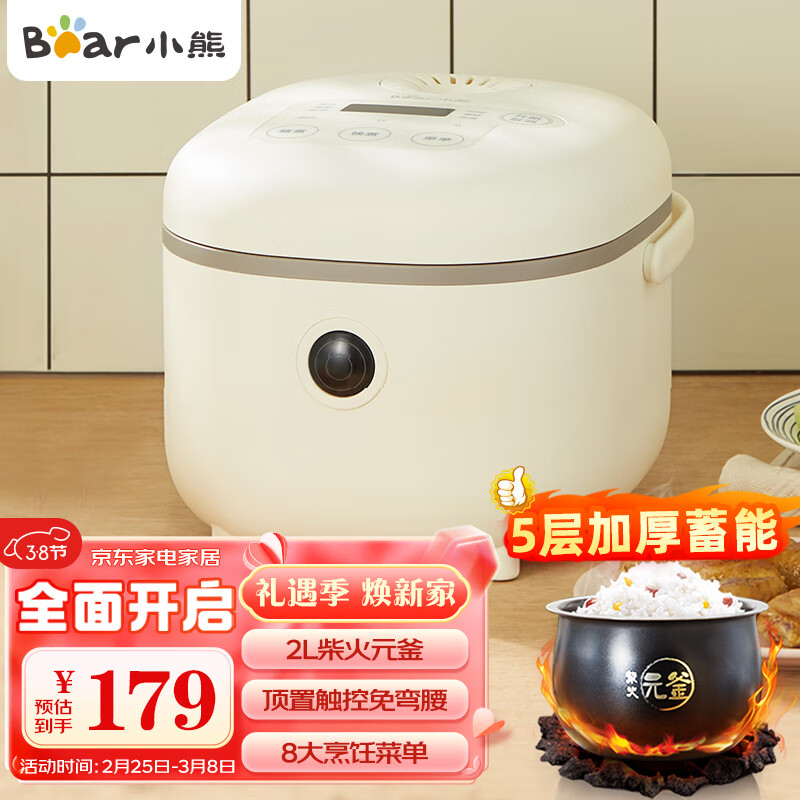 小熊(Bear)电饭煲小 2升迷你小容量智能预约小米粥保温1-2人小型多功能柴火元釜内胆2-3人电饭锅2L DFB-B20A1价格:178.00元!