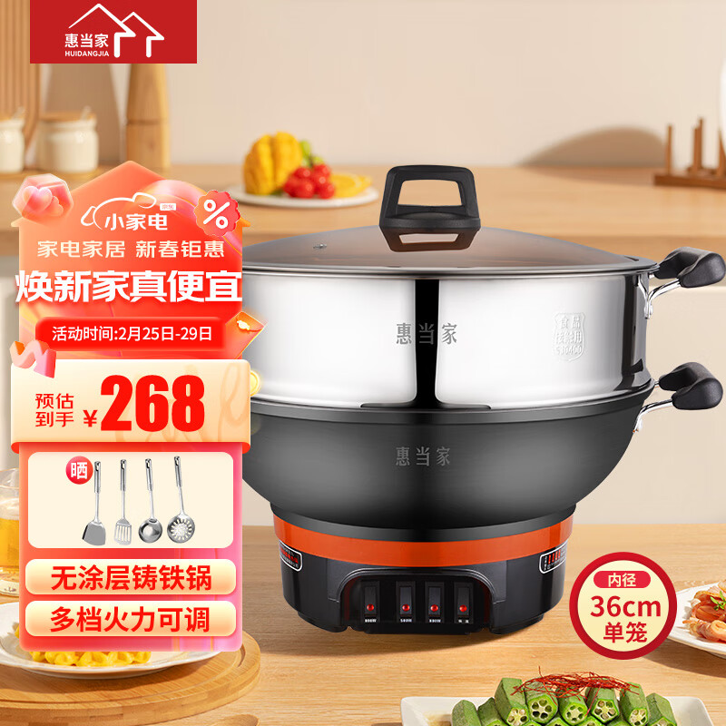 惠当家(Hui Dang Jia)电炒锅多功能电热锅电锅加厚电蒸锅电煮锅一体铸铁锅电火锅多用途锅 铸铁锅身-36cm单笼 6L价格:278.00元!