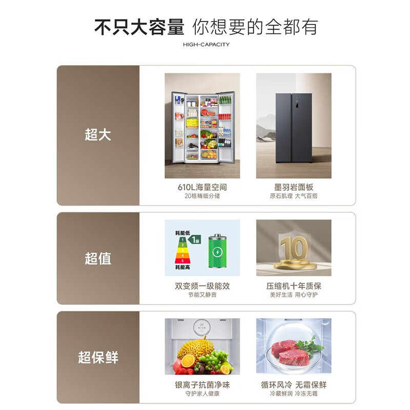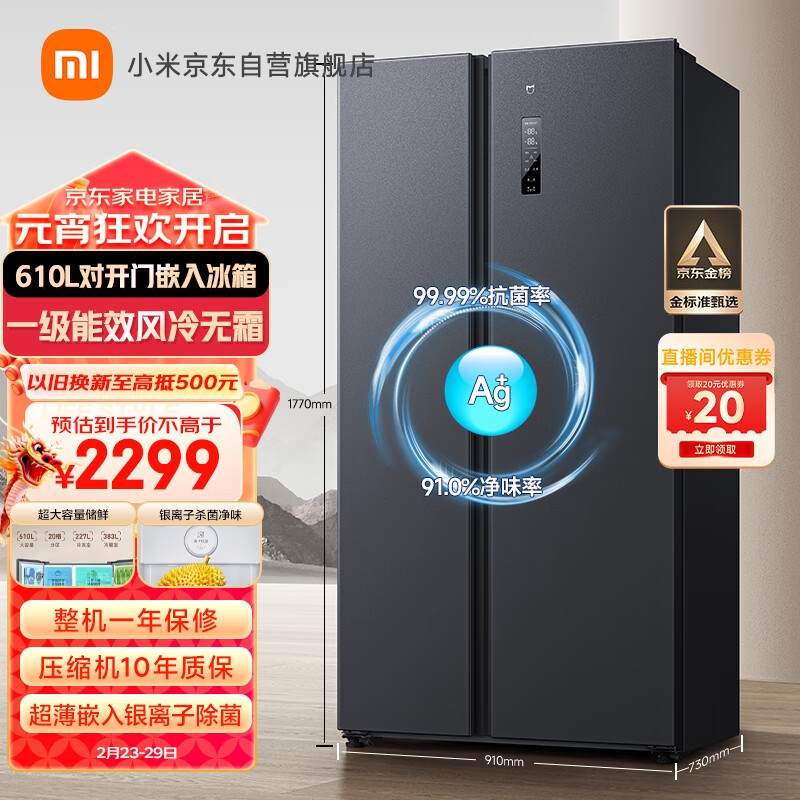 米家小米610L对开门大容量家用冰箱双开门 一级能效风冷无霜超薄嵌入银离子除菌 BCD-610WMSA价格:2299.00元!