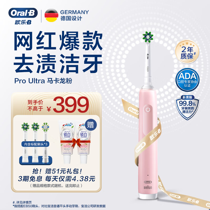 欧乐B成人电动牙刷成人Pro4Ultra小白刷3D声波圆头Pro系列深度清洁牙龈按摩情侣礼赠生日礼物价格:399.00元!