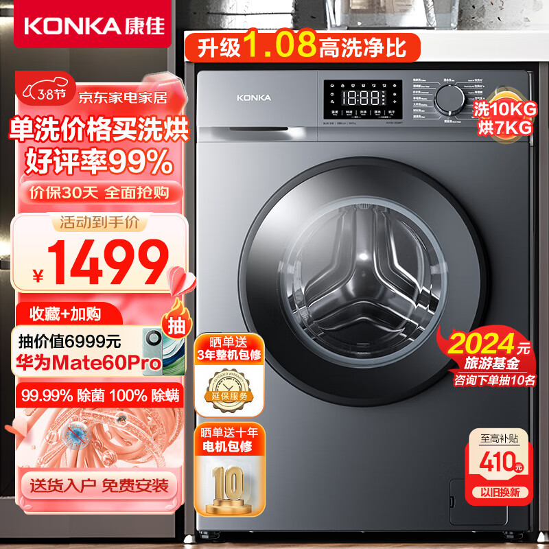 康佳(KONKA)洗衣机10KG超薄全自动滚筒洗衣机 洗烘一体机 内衣洗衣机 上排水 烘干除螨大容量 KH100-1202BPT价格:1499.00元!
