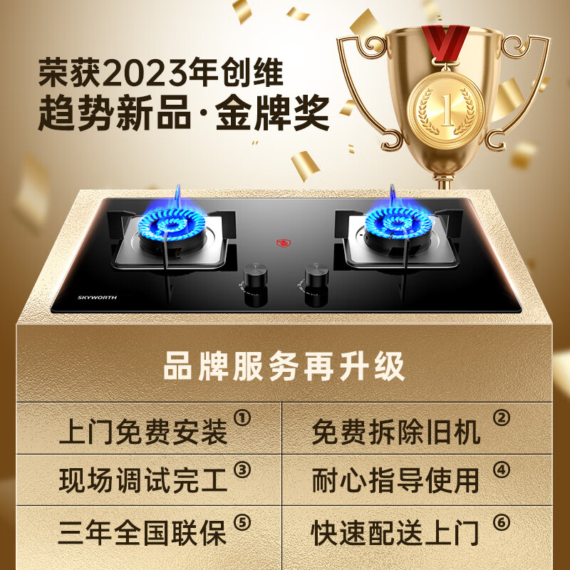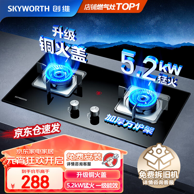 创维(Skyworth)燃气灶双灶家用 天然气猛火灶 5.2kW大火力灶具 台式嵌入式 钢化玻璃灶台免改孔Z50BS-1/天价格:288.00元!