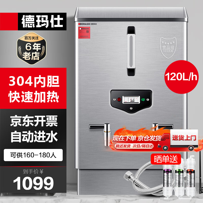 德玛仕(DEMASHI)开水器商用 电热开水机 全自动进水 304不锈钢 烧水器商用 KS-120P(标准款)380V价格:1099.00元!