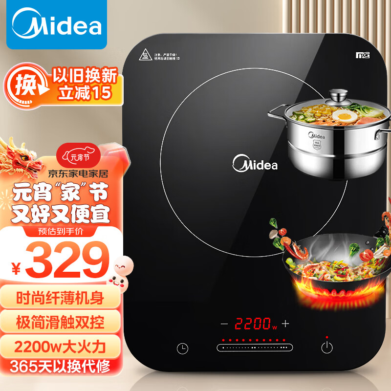 美的(Midea)电磁炉 家用大功率 2200W 恒匀火技术 智能断电 微晶面板 C22-WH2237(配汤蒸锅+渗氮炒锅)价格:329.00元!