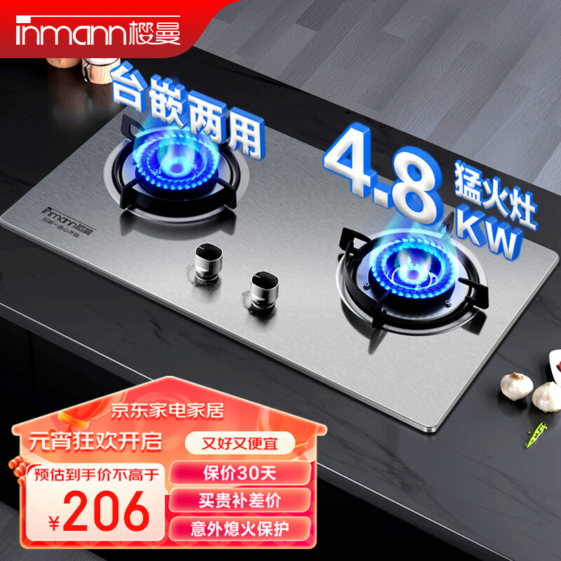 樱曼 燃气灶 煤气灶 双灶 不锈钢台式/嵌入式 一级能效4.8KW 大火力猛火灶具 JZT-G108A(天然气)价格:206.00元!