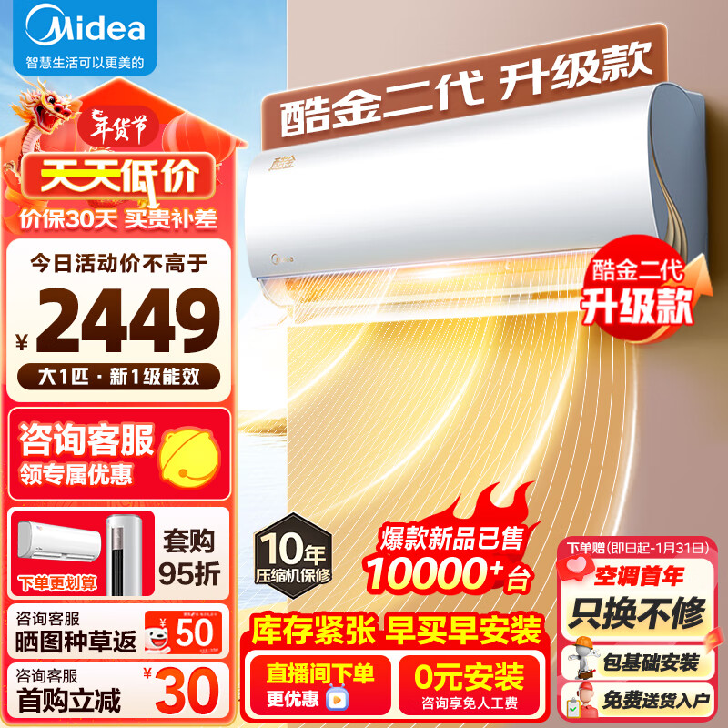 美的(Midea)空调大1匹挂机 酷金二代升级版 新一级能效 节能省电 壁挂式 卧室书房智能空调 KFR-26GW/N8ZHA1Ⅱ价格:2449.00元!
