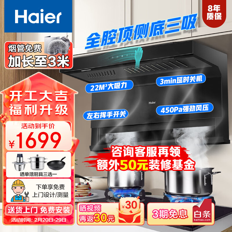 海尔(Haier)油烟机 挥手智控顶侧双吸抽油烟机 家用7字型450pa 22立方大吸力大尺寸油烟机CXW-258-EC710[家电]价格:1899.00元!