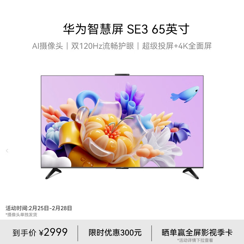 华为Vision智慧屏SE3 65英寸 超级投屏4K超高清120Hz屏 AI摄像头智能液晶超薄护眼电视机HD65KUNA价格:2999.00元!