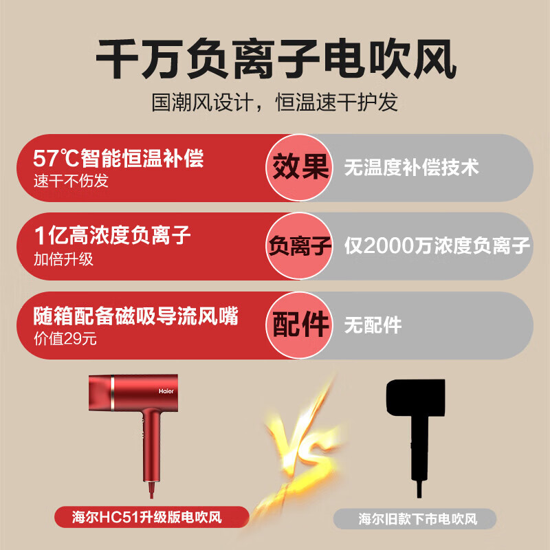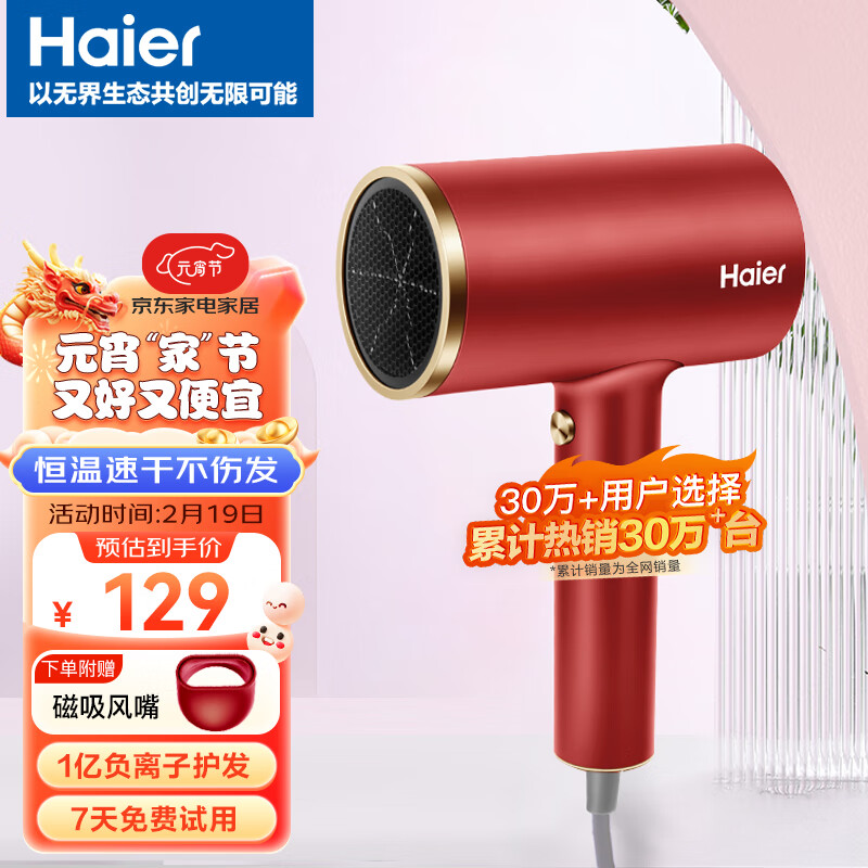 海尔(Haier)吹风筒家用大功率负离子恒温速干护发电吹风机冷热大风量礼物送女友 HC51-2026 升级版朱雀红价格:129.00元!