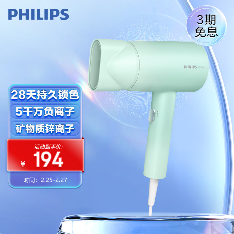 飞利浦(PHILIPS)电吹风机 3系炫色筒 锌离子防晒护色 5000万负离子 烫染修复 橄榄绿价格:194.00元!