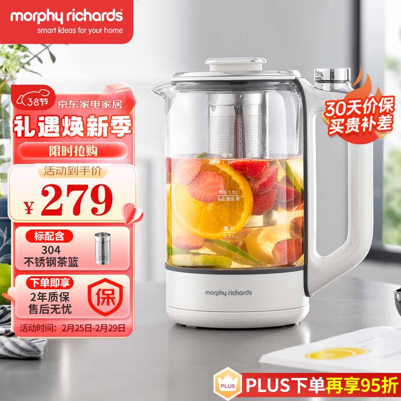 摩飞电器(Morphyrichards)养生壶 煮茶器烧水壶煮茶壶 多段恒温玻璃花茶壶 变频烹煮智能菜单1.5L大容量 MR6089白价格:269.00元!