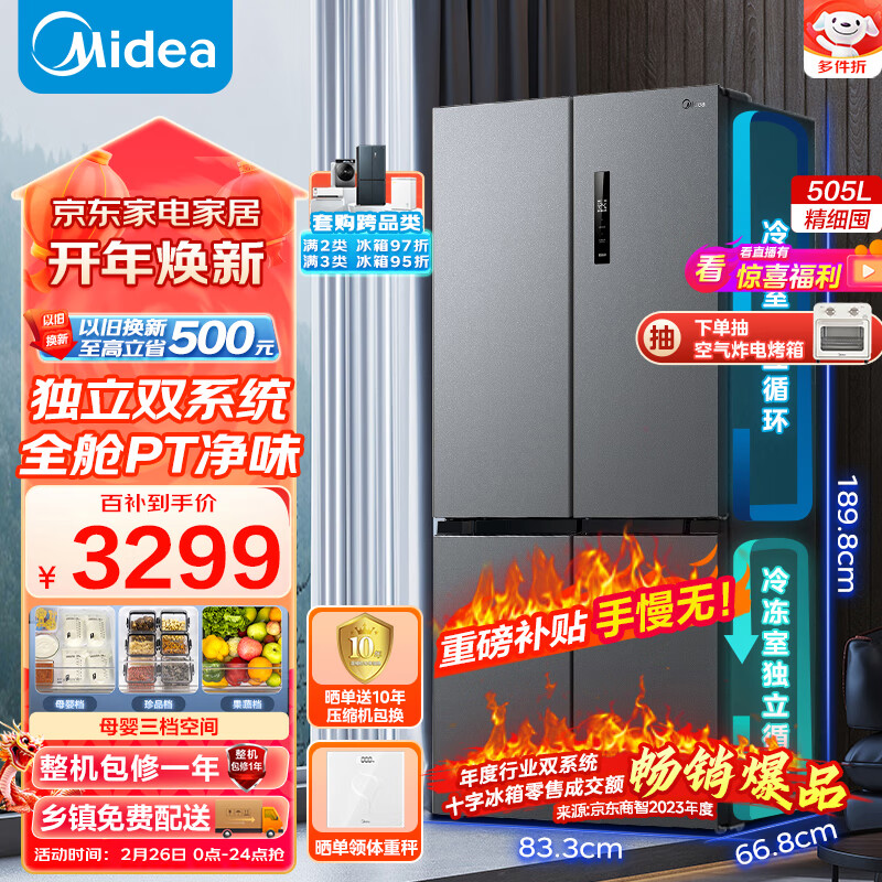 美的(Midea)531双系统双循环对开双开十字四开门风冷无霜一级能效变频大容量家用智能电冰箱MR-531WSPZE价格:3399.00元!