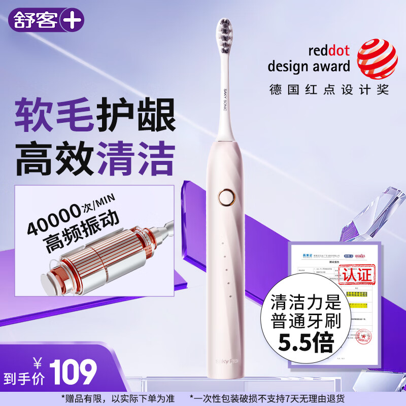 舒客【开学礼物】情侣电动牙刷智能换区清洁美白成人学生牙刷电动送男友/女友5种模式电量提醒 T2粉价格:129.00元!