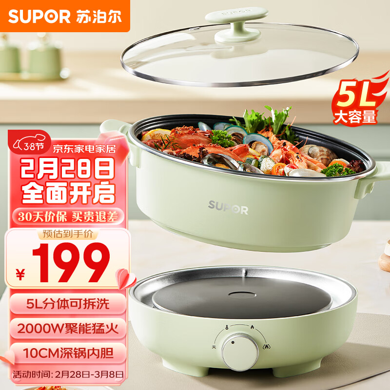 苏泊尔(SUPOR)电火锅 分体式可拆洗 家用5L大容量火锅专用锅 电煮锅 电炒锅多功能一体锅不粘锅 H30YK839价格:189.00元!