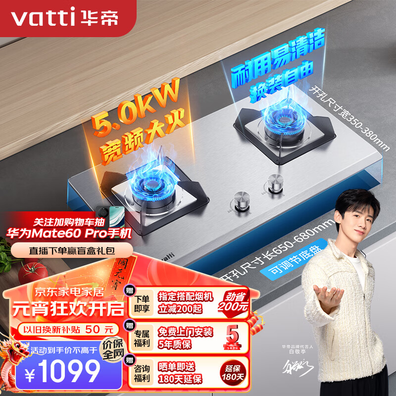 华帝(VATTI)燃气灶天然气灶家用嵌入式易洁耐用不锈钢面板台嵌两用双眼灶台 5.0kW猛火换灶不改孔 JZT-i10065A价格:1099.00元!
