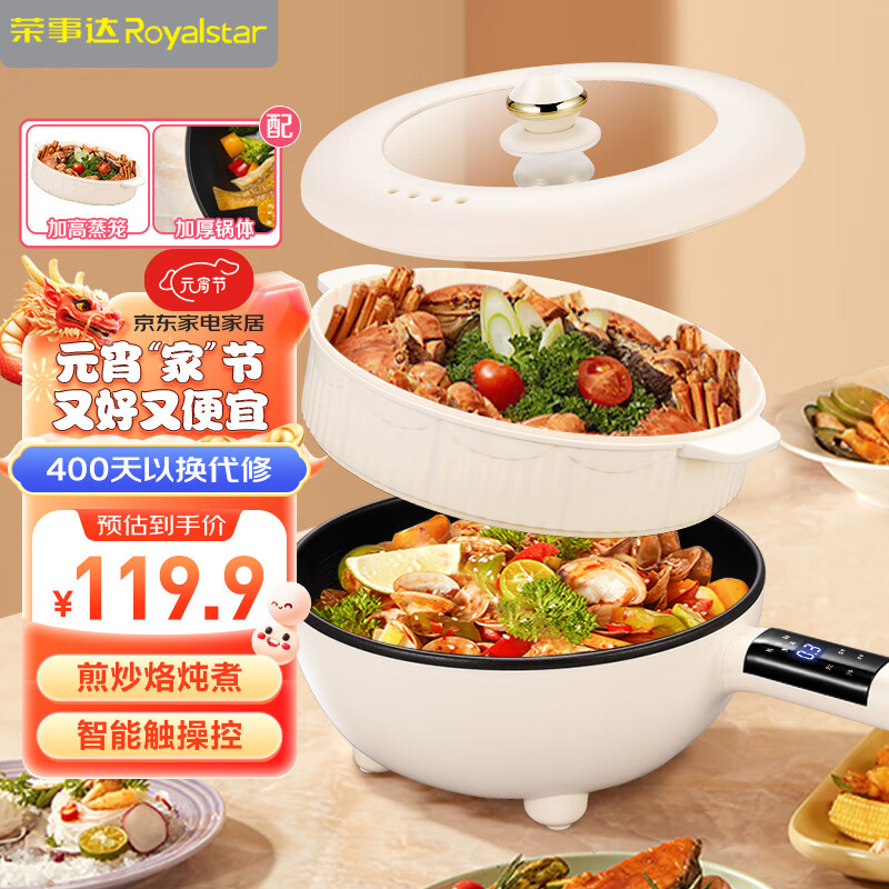 荣事达(Royalstar) 电炒锅 家用电火锅多功能4L容量一体电煮锅煎烤不沾电热锅 DCG04A3价格:119.90元!