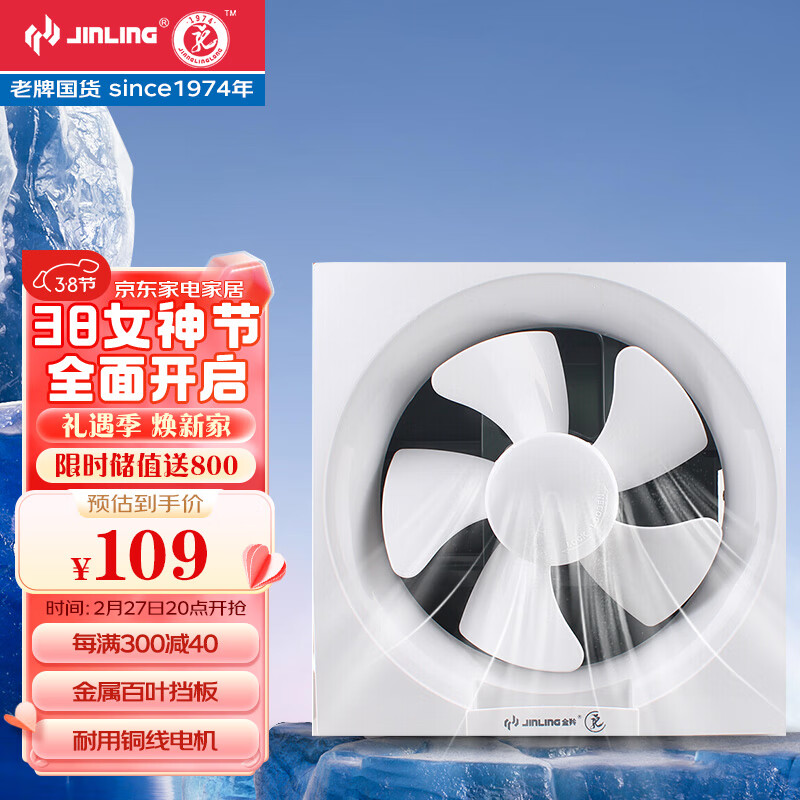 金羚(JINLING)厨房卫生间排气扇油烟换气扇浴室排风扇墙窗式10寸 APB25-5-1S1价格:109.00元!
