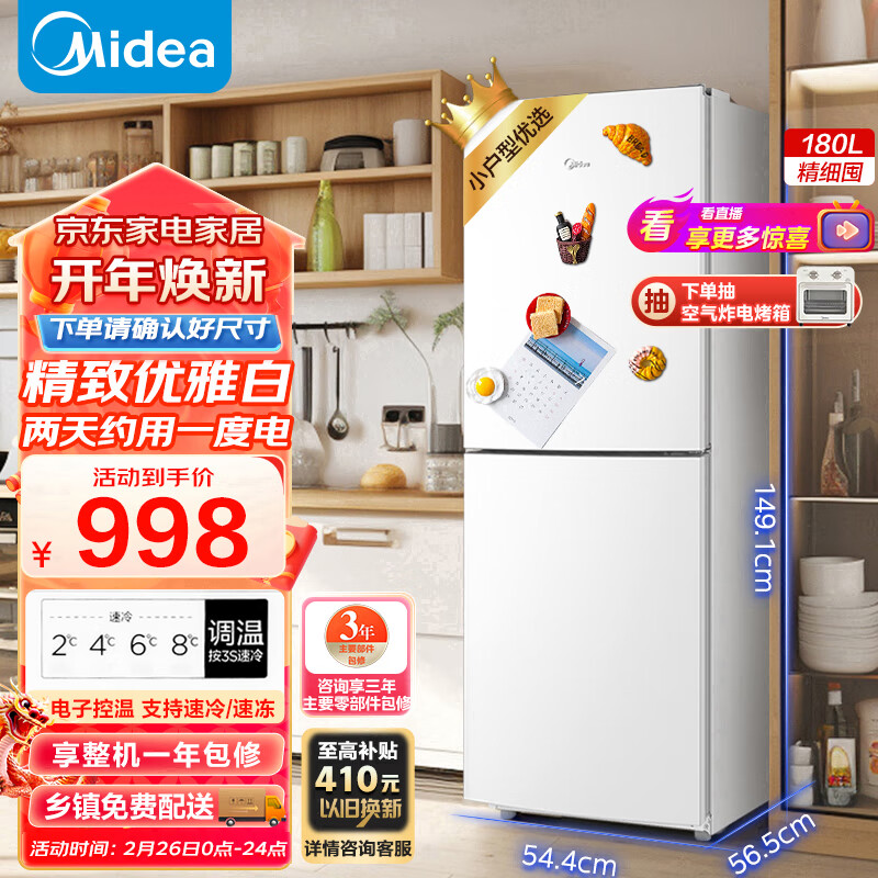 美的(Midea)180升白色双开门两门小型家用电冰箱租房宿舍低音节能可冷藏冷冻速冻MR-189E以旧换新172升级款价格:1098.00元!