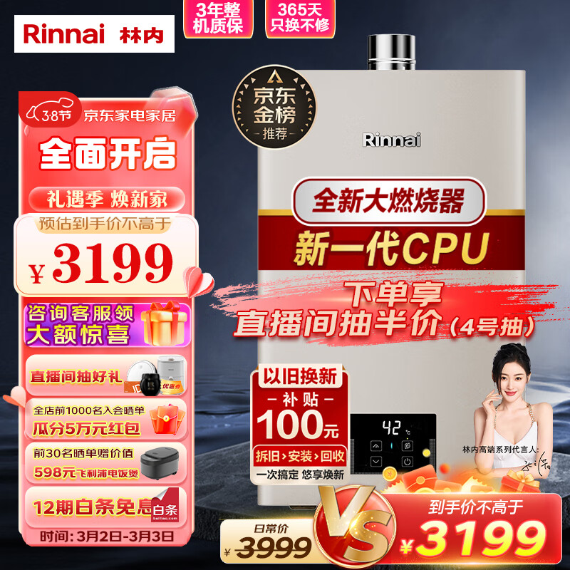 林内(Rinnai) 16升燃气热水器 全新智慧芯 恒温再升级 焕境系列 天然气12T RUS-16GD32(JSQ31-GD32)价格:3199.00元!