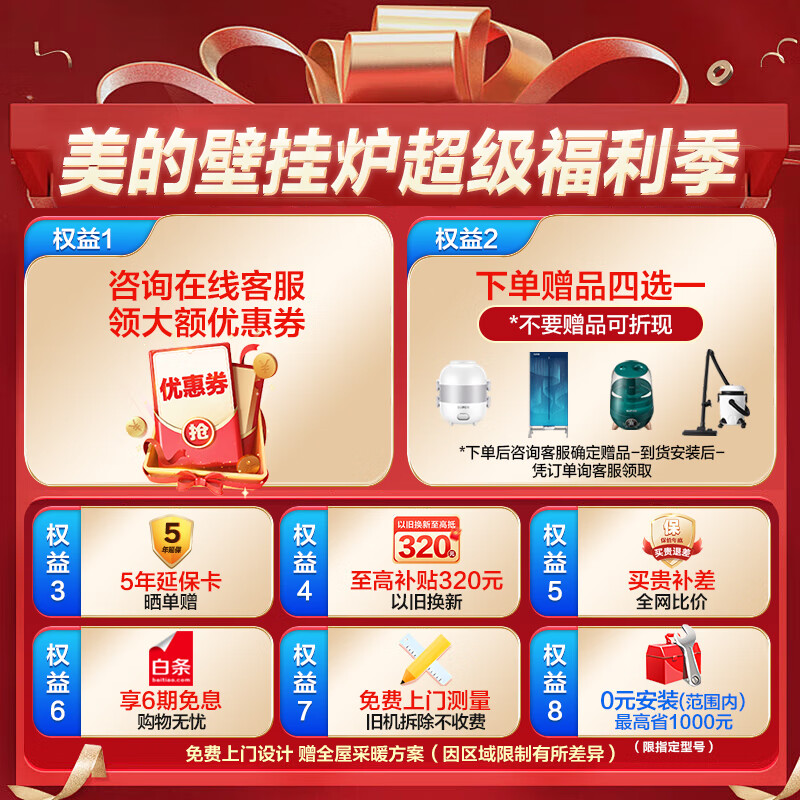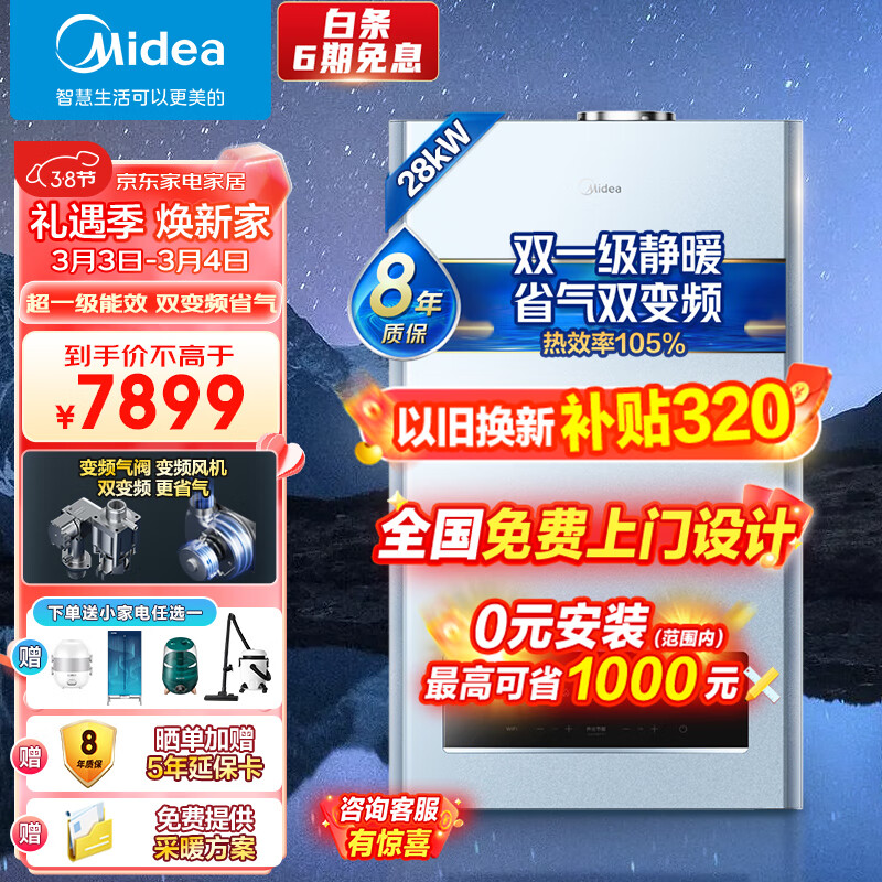 美的(Midea)双变频省气 一级能效 低噪冷凝式燃气壁挂炉 天然气供暖 家用地暖采暖锅炉 一价全包LL1PBD28-R53价格:7899.00元!