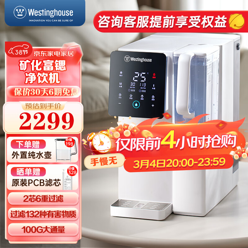 西屋(Westinghouse)台式即热免安装净饮一体机家用 RO反渗透净水器 加热直饮机 桌面即热式饮水机 C5白色富锶版价格:2499.00元!