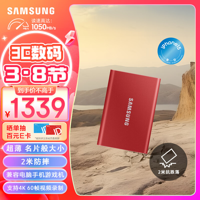 三星(SAMSUNG) 2TB Type-c USB 3.2 移动固态硬盘(PSSD) T7 红色 NVMe传输速度1050MB/s 超薄时尚价格:1339.00元!