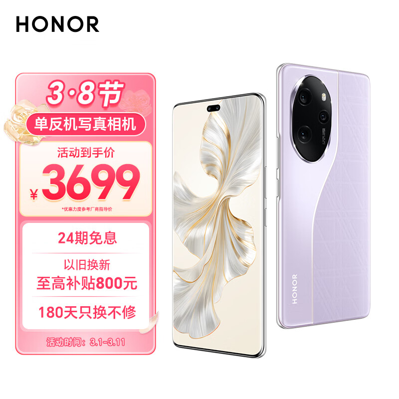 荣耀100 Pro 单反级主摄 荣耀绿洲护眼屏 第二代骁龙8旗舰芯片 立体声双扬声器 OIS 16+256 莫奈紫 5G价格:3699.00元!
